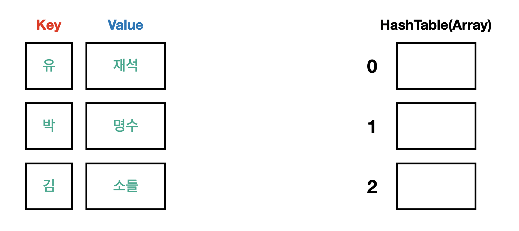 만약 다음과 같이 세 개의 Key-Value를 내가 해시 테이블에 저장하려 함
