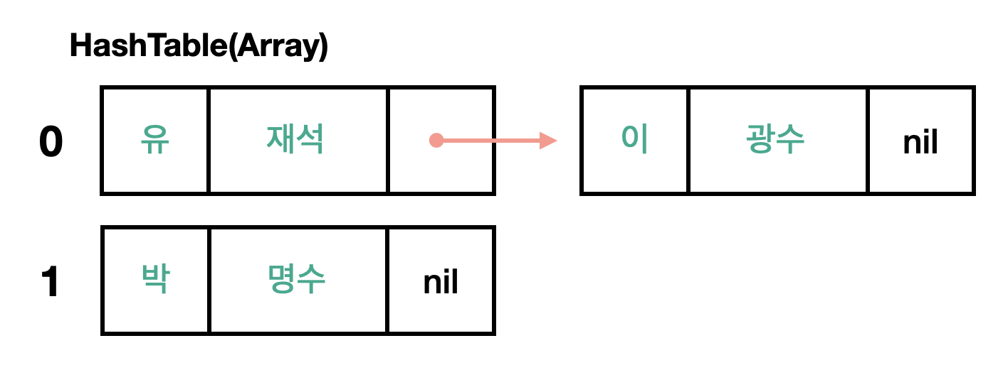 하나의 해시 주소값에 2개 이상의 Value가 연결 리스트로 이어져 있기 때문에,